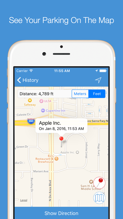Forgot where you parked your car again? This app will remember the parking location and show the direction from your current location to the parking spot. Features: - Parking History: All of your parking locations will be saved. - Additional Information: You can enter your own information about your parking location. - Adjustable Parking Spot: You can drag the pin to move to the desired location. - Compass Mode: Get to know which way you are facing. - Map Type: You can toggle between Standard, Hybrid and Satellite view. - Distance: See distance from current location to the parking spot in meters or feet. Pro Version Features: - Share Parking Information with your friends - Set Parking Meter Reminder - No Ads - Apple Watch supported