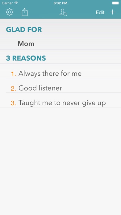 When is the last time you expressed your appreciation for someone special in your life? Take a minute to think of a moment when you were truly happy. Who made that moment so special? Let them know! Introducing 3 Reasons for iOS, a sister app to Wants & Thanks. 3 Reasons is a simple and elegant way to express gratitude for the people and things in your life. Enter the name of someone or something you're grateful for and up to 3 reasons you appreciate them. Keep it private or send your list to that person as an image, text, or PDF. Sharing options include social media like twitter and Facebook, email, and text. Glad For • Name a person that you are Glad For • Name items that you are Glad For • List up to 3 reasons why you are glad for that person Features • Reorder numbered reasons by long press • Share to Social Media or by email • Export to PDF • Print • iCloud Sync I am Glad For (examples): • Dad • Mom • Wife • Relatives • Friends • John, Linda... • What I have • Doctors • Health • Talent • iPad, iPhone • Technology • App that you like • Podcast • Life • Sports • Gratitude • God, Religion • Items that make our life easier • Anything...