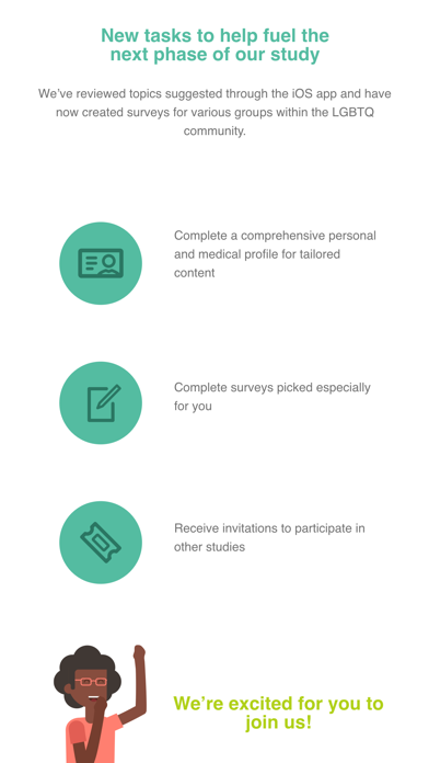 Help shape the first large-scale, long-term health study of LGBTQ people! The PRIDE Study app allows members of the LGBTQ community to inform and influence what aspects of our health will be studied in the upcoming PRIDE Study. The PRIDE Study is a long-term collaboration that will help health professionals make informed decisions about our health. Learn more below. WHO'S ELIGIBLE TO PARTICIPATE IN THE PRIDE STUDY? You are eligible to join the PRIDE Study if you are: • 18 years of age or older • A resident of the United States • Comfortable reading and writing on your iPhone in English • LGBTQ or another sexual or gender minority This app is designed for research and education purposes only. This app is not meant to provide medical advice, attention, or treatment. If you are having a medical emergency, call or contact your healthcare provider. WHAT IS THE PRIDE STUDY? The PRIDE Study is the first large-scale, long-term health study of people who identify as lesbian, gay, bisexual, transgender, queer (LGBTQ), or another sexual or gender minority. By participating in The PRIDE Study over time, your unique story teaches us about the health and wellbeing of LGBTQ people like you. WHO IS CONDUCTING THE PRIDE STUDY? The PRIDE Study is being conducted by doctors and research scientists at The University of California, San Francisco. WHAT IS THE GOAL OF THE PRIDE STUDY? The mission of The PRIDE Study is to improve the health of LGBTQ people. To meet this goal, we need to understand how being LGBTQ affects your health. The PRIDE Study deeply explores how the experience of being LGBTQ is related to all aspects of health and life. We study the unique health care disparities, strengths, and resiliencies of our communities. We share our findings through a variety of methods to impact LGBTQ communities and health professionals. HOW IS MY INFORMATION KEPT SAFE? As doctors and research scientists, we understand that information about your life and health is personal. Like our patients’ health information, it is our priority to keep the information you share private and secure. All communications between you and our app are secure electronic transmission, and our data are physically secure. All our systems meet the requirements defined by federal law (United States Health Insurance Portability and Accountability Act or HIPAA). HOW IS MY INFORMATION SHARED? Your participation in The PRIDE Study is wasted if we don’t share the results with the people and organizations that can make real change for LGBTQ health. Results from The PRIDE Study will be shared directly with you, healthcare professionals, policy makers, and community organization. We will never share individual information; only aggregated (grouped) data will be shared.