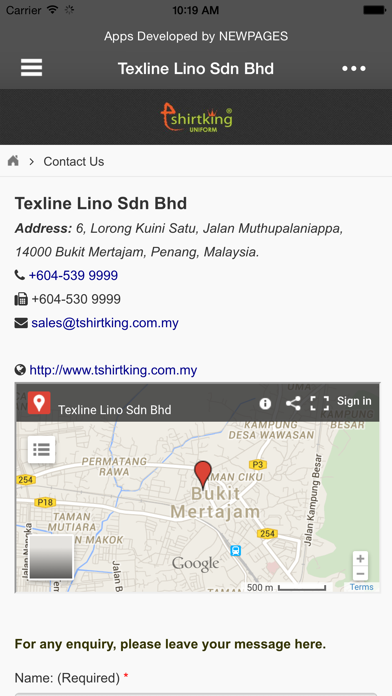 Texline Lino Sdn.Bhd. is a uniform supplier company. Our company is located in Bukit Mertajam, Penang (Pulau Pinang), Malaysia. Our products include premium gifts, shirt, T-shirt, jacket, vest, pants, sports & cycling wear, towel, cap, woven & non woven bag, paper bag, PVC bag, woven & non woven apron, etc. We supply our products to government sector, university, college, school, corporate company, organization, event, club, tourism, hotel, and F&B. Our Products are: Free Design Free Delivery Unlimited Order Mission & Vision Our main mission is to achieve higher production level to fulfill customer’s satisfaction and promise to deliver the best quality of products with fair prices. Wear Your Idea! Our products are directly delivered to customer, we didn’t go through any agent and middleman. Best quality & service are assured and free delivery for whole Malaysia. Key Features: - Access latest company information and news from us. - Easily search products and directly send email enquiry to us. - Easy to find our contact information and location. - Push Notification update for products & news. Website: http://www.tshirtking.com.my