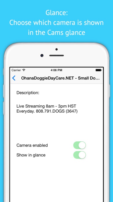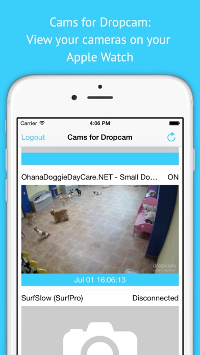 Cams for Dropcam is the best way to view your Dropcams from your Apple Watch! Features: * Choose which camera is shown in the Glance * Turn your cameras On and Off * See the last time your cameras updated * View the status of your cameras Camera feeds are updated with the latest image approximately once every five seconds. This refresh rate may vary depending on your networking connection and the status of the camera. Note: Cams is not endorsed by or affiliated with Dropcam in any way.