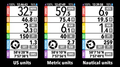 SPEED is a dashboard app for use whenever you’re on the move, whether by car, boat, bike or on foot. Here are some of the things SPEED can tell you: How fast am I going? What was my top speed? How far have I traveled? How high up above sea level am I? Where did I put my car? How far away am I from where I started? How far has the boat drifted? How can I tell someone where to find me? Feature list: Speed: Current speed in mph, kph, knots or m/s Max: Highest speed achieved Odo: Distance traveled in miles, km or nautical miles Altitude: Feet or meters above mean sea level Beacon: Distance and bearing to a set point Position: Current latitude and longitude SMS: Send your current position by SMS GPS signal strength 24 hour time with seconds Battery charge level and charging indicator