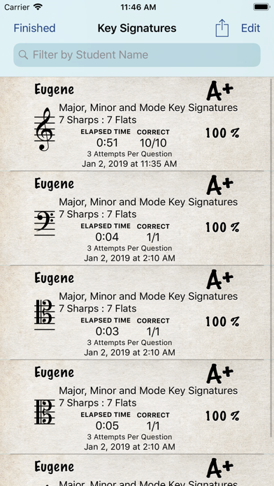 Teachers, students and professional musicians: Recognize Major, Minor, and Diatonic Mode key signatures. Jazz musicians will particularly benefit from the modes recognition. Includes a 'Grade Book' list of all saved quiz results that you can edit and create a pdf of to print or email. • Set separate maximum number of sharps or flats for the quiz. • Set only major and minor keys, only the seven diatonic modes, or combine both groups into the quiz. • Treble, Alto, Tenor, and Bass clefs. • Set the number of questions, or stop anytime and grade only the number answered. • Set up to three tries to get the correct answer. • Optionally record how long it takes to finish the quiz. The Grade Book is filterable by student name. Access to the list can be password protected by entering a password in the device's Settings app. Grades include the student's name, date and time the quiz was taken, all relevant quiz settings (clef, number of questions, etc.), and score (percentage and letter grade).