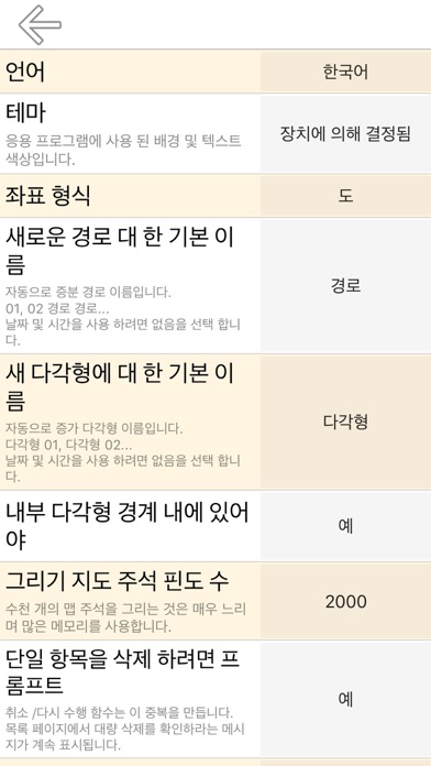 위성 보기에서 토지, 도로, 공원, 국가, 호수 등을 측정합니다. 거리, 면적 및 둘레를 계산합니다. 이 응용 프로그램은 대부분 경쟁 하지 않습니다 제공 하는 기능: - 사용자 정의 거리와 지역 단위를 추가 합니다. - 내부 다각형을 그립니다. 예를 들어 물 제거의 시체와 함께 지역 토지. - 패스의 중간에 점을 추가 (가장 유일한 경로 끝에 추가할 수 있습니다)는 길의 끝에 추가할 탭. 긴 패스의 중간에 추가를 누릅니다. - 스왑 경로 또는 다각형에서 두 점. - GPS 수신기에서 현재 위치를 추가 합니다. 특징: - 3 지도 레이어 옵션 - 내보내기 및 가져오기.kml 파일 보관용, iCloud, 이메일, 등을 통해 - 핀은 드래그 가능하고 수동으로 편집 할 수 있습니다 - 이름, 메모, 및 각 경로 다각형에 대 한 필드를 색상 - 이메일 이나 텍스트 메시지 경로 다각형 데이터 - 4 자세한 정도 모드입니다. 보고 싶은 정보만 참조 - 우편 번호, 도시, 주소 등으로 검색 - 주소 지도에 근처 포인트 4 드로잉 모드: - 경로 - 다각형 - 다각형 내부 빈 공간 - 편집 모드 (실수로 편집 방지) 값 경로 대 한 표시: - 총 거리 - 각 좌표에 대 한 증분 거리 다각형에 대 한 표시 되는 값: - 지역 - 경계 - 각 측에 대 한 거리 경로 또는 다각형 4 가지 방법의 1에서 포인트를 추가: - 지도에 탭 - 현재 위치를 사용 하 여 - 좌표를 수동으로 입력 - 가져오기.kml 파일 기본 거리 단위는 다음과 같습니다. - 미터 - 발 - 야드 - 킬로미터 - 마일 - 해상 마일 기본 지역 단위는 다음과 같습니다. - 평방 미터 - 평방 피트 - 평방 야드 - 평방 킬로미터 - 평방 마일 - 해리 평방 마일 - 평방 에이커 - 평방 헥타르 좌표 형식을: - 도 - 도, 분 - 도, 분, 초 - UTM / UPS (유니버설 횡방향 메르카터) / (유니버설 폴라 스테레오그래픽) - MGRS (군사 그리드 참조 시스템) English: Measure land, roads, parks, countries, lakes, etc from a satellite view. Calculates distances, areas, and perimeters. Features that this application offers that most competitors do not: - Add custom distance and area units. - Draw interior polygons. For example, land area with bodies of water removed. - Add a point to the middle of a path (Most only allow you to add to the end of the path) Tap to add to the end of a path. Long press to add to the middle of a path. - Swap two points in a path or polygon. - Add your current location from GPS receiver. Features: - 3 map layer options - Export and import .kml files via Dropbox, iCloud, email, etc - Pins are draggable and manually editable - Name, notes, and color fields for each path and polygon - Email or text message path and polygon data - 4 verbosity modes. See only the information that you want to see - Search by postal code, city, address, etc - Get addresses near point on map 4 drawing modes: - Path - Polygon - Polygon with hollow spaces inside - No edit mode (to prevent accidental edits) Values displayed for paths: - Total distance - Incremental distance for each waypoint Values displayed for polygons: - Area - Perimeter - Distance for each side Add points to a path or polygon in 1 of 4 ways: - Tap on the map - Use current location - Enter coordinates manually - Import .kml file Default distance units include: - Meter - Foot - Yard - Kilometer - Mile - Nautical mile Default area units include: - Square meter - Square foot - Square yard - Square kilometer - Square mile - Square nautical mile - Square acre - Square hectare Coordinate formats: - Degrees - Degrees, minutes - Degrees, minutes, seconds - UTM / UPS (Universal Transverse Mercator) / (Universal Polar Stereographic) - MGRS (Military Grid Reference System)