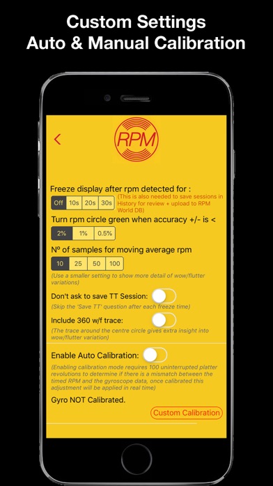 The best turntable RPM speed and accuracy testing mobile app available. See the RPM speed variations, wow/flutter, of your turntable in real time graphics like you've never seen before. There are many ways of testing the average RPM of your turntable, some turntables even have this built in, however there is no other practical way of showing the wow/flutter variation over time than RPM. The average RPM may look great however a large wow/flutter will make the sound terrible, RPM will help you identify the problem and visualise improvements you make. Test the RPM and wow/flutter accuracy of your turntable, whether 16, 33 1/3, 45, or 78. Now with the Worldwide RPM Turntable Accuracy Database you can research what other RPM users are finding out about their turntable's accuracy and what they think of them, + Stats of the most popular TT makes & models ● RPM is proud to be recommended by Rega Research Ltd, makers of some of the best turntables in the world. ● Great review by top tech vlogger Techmoan on Youtube ● Used in high end TT reviews in Stereophile magazine Save all your rpm tests in My History for reviewing or sharing later. RPM uses the gyroscope in your iPhone to determine the rotation speed of your turntable, automatically determines which speed setting you're on, and reports how accurate it is. Simply place your iPhone flat over the centre of the turntable platter. As the iPhone rotates the display will remain stationary from your perspective for easy reading. The UNIQUE feature of RPM is that it shows a scrolling graph of the rpm accuracy variation over time, this shows wow/flutter effects, especially those associated with the turntable not being level, belt wear, etc. You can even detect the small drag caused by the stylus resting in the grooves. You can even visualise wow and flutter variations plotted actually around the vinyl centre to show a heat map of exactly where in the turntable rotation the inaccuracies occur. For Upgraders the history graph parameters can be customised to: - Set the moving average sample size. - Accuracy at which to turn the rpm circle sold green. - Set a duration after which the display updates will freeze so they can continue to be read after the turntable is stopped, this is also required to save sessions to History and upload to the World TT DB - detect and graph 16, 45, & 78 records. Calibration Mode is here! (Upgraders only plus not on iPod as compass required) The RPM realtime display is reliant on the iPhones gyroscope accuracy, which is normally very accurate, if you suspect yours isn't quite right then you can now use Calibration Mode to auto test and then apply any necessary correction in real time. This auto calibration uses the compass to count the turntable revolutions, if you have an older iPhone (not iPhone 6S or newer) then this may be unreliable, in this case you can still add your own multiplier if you have done an independent calibration. Extensive testing means we're now confident that using RPM can help you setup your turntable to be within 0.1% of its target RPM, assuming your turntable can be adjusted and is itself stable within that tolerance of course. Use 33 1/3 rpm for auto-calibration as at 45 and 78 rpm the compass simply won't be able to keep up. Note that calibration isn't normally required, and that only uncalibrated sessions may be uploaded to the World TT DB to ensure all data is comparable. Now with the World RPM Turntable Performance Database, accepting submissions from RPM users worldwide to build the ultimate resource for researching the most accurate turntables out there. Upgrade to join in and upload your own TT data, go to Settings and make sure you have the Freeze time set then do an RPM session as normal. At the end of the time you will can name your session after which you will have the option to upload it to the World DB. You can always upload from History later too. Download for free and give it a try.