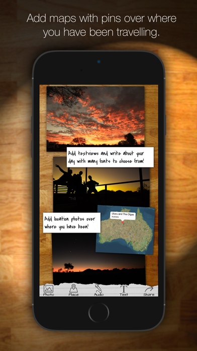 My Diaries is a interactive diary app. Take your photos, add text, a voice memo or a map of where you've been. The objects are moved around on the table with simple gestures. Take this opportunity to remember your days in a fun and beautiful way!