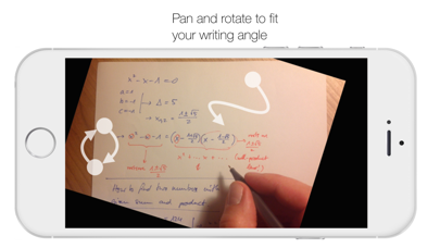 Use your iOS device as an overhead camera in your presentations, classes and lectures: Pan, zoom and rotate to adjust the frame to your writing habits. Free from UI clutter – just shows what you want to show. Single tap to focus. Double tap to reset the camera frame. Tripe tap to take a photo. Smart orientation handling.