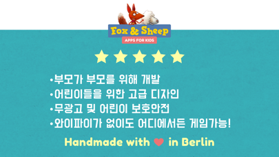 작은 여우가 감기에 걸렸어요. 어떻게 낫게 해줄 수 있을까요? 박쥐가 날개를 부러뜨렸어요. 어떻게 해줘야 할까요? 우리 동물 친구들이 머리를 부딪히거나, 사탕을 너무 많이 먹어서 배가 아프거나, 작은 상처가 나거나, 햇볕에 지나치게 그을렸을 때는 정말 좋은 의사 선생님의 도움이 필요해요! "자장자장", "작은 여우의 음악 상자", "자장자장 서커스" 등의 베스트셀러 앱을 위해 일러스트레이션과 감독 작업을 담당했으며 오스카상 후보에 올랐던 예술가인Heidi Wittlinger의 작품, 어린이들이 좋아할 새롭고 멋진 3D 앱! 이 앱에는 재미있는 애니메이션, 멋진 3D 일러스트레이션, 그리고 흥미롭고 짧은 동영상이 가득합니다. 우리 동물 친구들이 나무 위 신비한 오두막에 사는 동물 의사에게 치료를 받기 위해 기다리고 있습니다. 체온 측정, 약 복용, 석고 붕대 감기 등 어린이들이 한 번쯤 경험해본 치료법을 놀이처럼 즐길 수 있습니다. 물론, 달팽이를 먹는 건 올빼미한테만 좋은 약이겠죠! 하이라이트: 1. 여우, 박쥐, 토끼, 두더지, 거미, 고슴도치 올빼미 등 앱에 포함된 7종류의 동물들과 21가지의 다양한 상처, 아픔, 병. 2. 어린이들이 동물 친구들을 치료하고 다시 즐겁게 놀 수 있게 도와주는 다양한 치료법과 약을 선택할 수 있습니다. 3. 작은 여우 동물 의사: ‘작은 여우 동물 의사‘는 오스카상 후보에 올랐던 예술가 Heidi Wittlinger가 만들어낸 최초의 3D 앱입니다. ‘자장자장‘, ‘작은 여우 동물 의사‘, ‘자장자장 서커스‘ 등의 예술 감독을 담당하기도 했습니다. Heidi Wittlinger는전 세계에서 5백만명이 다운로드해서 사용하고 있는 앱들을 제작한 뛰어난 작가입니다. 동물 의사가 되고 싶은 어린이들의 꿈을 이루어 주는 앱! Fox & Sheep에 관하여: 우리는 베를린 소재 어린이 앱 스튜디오이며 2~8세 어린이를 위한 고급 게임을 개발하고 있습니다. 우리 자신들도 부모이며 열정과 심혈을 다해 제작에 임하고 있습니다. 우리는 우리 앱을 위해 세계 최고의 일러스트레이터를 선택함으로써 어린이를 위한 최고로 아름다운 앱을 개발하여 제공하며 우리와 당신의 자녀들에게 풍요로운 삶을 제공하려고 합니다.