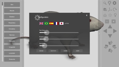 The 3D Rat Anatomy app is an interactive model designed for students, teachers and researchers to visualize the basic anatomy of a lab rat. This app let you explore the anatomy of a rodent that is widely used in scientific research, the Rattus norvegicus. The interactive three-dimensional model allows visualizing the internal structures of the rat, such as bones, muscles, respiratory, digestive and urogenital systems, as well as the main vessels and nerves. Each anatomical system can be viewed and manipulated layer by layer or simultaneously with other layers, at various zoom levels. Individual anatomical structures can be highlighted and display a caption, or they can be removed to permit viewing of deeper structures. Available in English, Spanish, Portuguese, French, Japanese and Latin. This App is intended to be a supplemental educational resource and should NOT be used as the only source of educational information, nor should the Software be used as medical advice or for medical diagnoses of any kind.