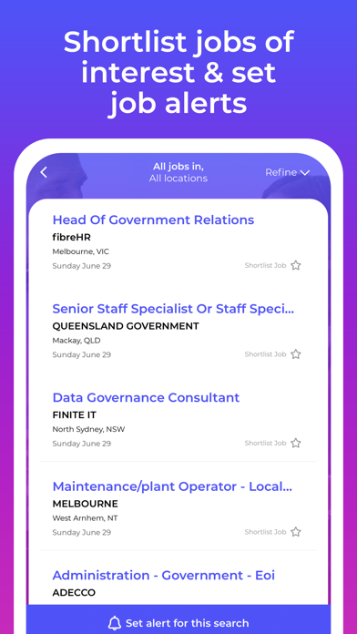 Find Government jobs, employment and career vacancies in Australia with the No. 1 Government Jobs App. Search public sector and public service jobs at Local Government, State Government and Federal Government levels across Australia's largest employers including Federal Gov Departments, Australian Public Service, Public Sector Commission, NSW Government and Victoria Government. Government Jobs provides you access to thousands of jobs, work experience, internships, management and executive level career vacancies from Government websites and job boards across Australia. It also connects you to local, regional the industry based Talent Communities to access exclusive employment opportunities added from member employers. Talent Communities connect you to work, education, events, support and information for employment options and career pathways that interest you. Search – Scroll – Join – Apply • Thousands of Government job vacancies Australia wide. • Full-time, part-time, contract, internship, management & executive jobs. • Talent Community slider to scroll to join communities that interest you. • Simple location, keyword and industry job search. • Find work opportunities near you using your device’s GPS. • Create email Job Alerts within Talent Communities so jobs find you. Download the Government Jobs App for access to all Australian Government, public sector and public service jobs.