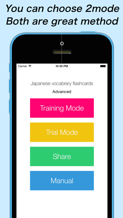 Made in Japan. Japanese studying app !! This app level is advanced. Since this app is flipping through flashcards automatically without a swipe, you can focus on memorization. Training mode that specializes in memorization. Trial mode that specializes in review. Efficient Japanese learning in two modes is possible. Rather than studying one by one slowly and carefully, even it is better to be repeated many times as fast as possible. Come on, Let's increase a lot of Japanese vocabulary !!