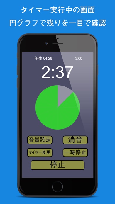 P-Timerはプレゼンや発表の場で使用するタイマーアプリです。 タイマー設定時間(発表時間)が経過すると「チーン」とベルの音を鳴らします。設定時間を超えた際、指定時間ごとにベルを自動で鳴らすことができます(複数回鳴らすなど)。 残り時間がすぐわかるように、時間と円メーターを表示しています。 また、履歴を残すことができるので、いつ初めて、どれだけの時間で完了したのかを後から確認することができます。 プレゼンだけでなくスポーツ、勉強、仕事など使い方は様々です。 <機能> ・カウントアップ・カウントダウン ・タイマー実行中の画面からベルなどの音を鳴らすことが可能 ・タイマー動作中に一時停止、再開が可能 ・タイマー実行中に、経過時間がざっくりとわかるように円メーターを表示 ・タイマー実行中の円メーターの表示・非表示 ・タイマー実行中の円メーターを増やすまたは減らす ・開始時に音を鳴らす ・サスペンド時にタイマーを継続・一時停止 ・タイマー実行中はスリープ解除 ・複数種類のタイマー(設定時間)を登録可能 ・タイマー実行中にタイマーの種類を変更可能 ・履歴(最大200件) ・指定時間をオーバー時に音を鳴らすことが可能 ・オーバー時に連続して鳴らすことが可能 ・音量設定が可能 注1:プレゼンなどで使用する際、呼び出しなど起きないように電波をオフにしておくことをお勧めします 注2:本体の音量設定によりアプリ内での最大音量が決まるので、音が小さい場合、本体設定を確認してください <仕様> タイマーの時間:0秒 ~ 設定の上限は999分59秒 オーバー時の時間:0秒 ~ 設定の上限は999分59秒 オーバー時の動作:何もしない、1回鳴らす、オーバー時の時間ごとに鳴らす回数を増やす 履歴の保存:1 ~ 200 時間の表記方法:24時間と午前・午後 音の種類:ベル、銅鑼、ゴング、ゴング(連続) 注:本体の音量設定によりアプリ内での最大音量が決まるので、音が小さい場合、本体設定を確認してくださ