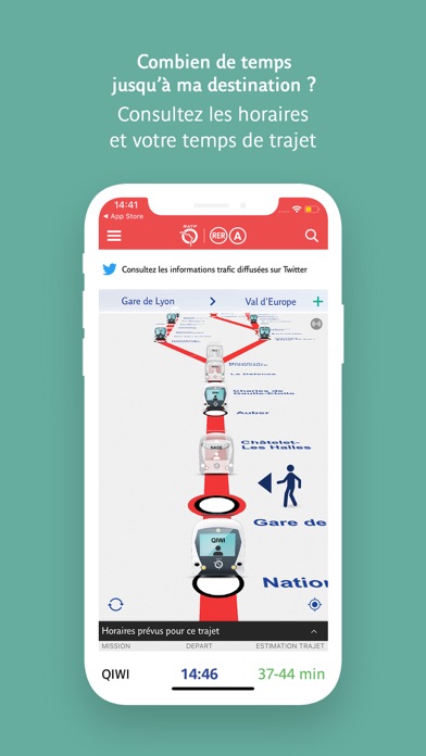 Pour des voyages plus faciles et plus sereins, la nouvelle application gratuite, monRER A de la RATP, répond en temps réel à toutes vos questions sur le déroulement de votre trajet. Où se trouve mon train ? Visualisez en direct la position et la progression des trains en circulation. Affichage en mode 3D ou plan de ligne, au choix. Dans combien de temps serai-je à destination ? Consultez votre temps de trajet estimé et les horaires de passage des prochains trains... Que se passe-t-il sur la partie de ligne que j'emprunte fréquemment ? Créez et gérez la liste de vos trajets favoris pour y accéder rapidement. Que se passe-t-il sur l'ensemble de la ligne ? Consultez le fil d'actualités Twitter RER A, sans avoir besoin d'être abonné, pour connaître l'état de la circulation. Accédez à l'info trafic réactualisée en continu par des bandeaux d'information ou des messages d'alerte en cas de perturbations. Pour plus de détail, vous pouvez consulter le blog du RER A https://rera-leblog.fr/