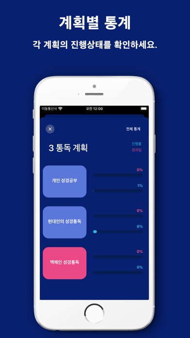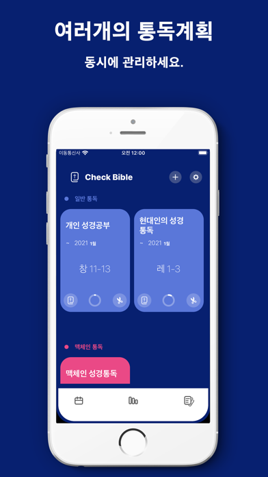 Check Bible ( 체크 바이블 ) * 성경통독 플래너 + 성경 읽기표 * Check Bible(체크 바이블) 은 성경통독을 위해 개발된 ‘성경통독 플래너’ 입니다. 통독계획을 세우고, 성경읽기표에 읽으신 장들을 체크하세요. ‘체크 바이블’은 남은 분량과 기간을 계산하여 매일 읽어야 할 말씀을 표시해 줍니다. 또한 연결된 성경을 통해서 쉽게 그날의 분량을 읽을 수 있습니다. 통계화면은 각 통독계획의 현재 진행상태를 한눈에 확인할 수 있게 나타내줍니다. 이제 체크 바이블을 통해 성경통독에 도전하세요. * 주요 기능 1. 성경 통독 계획 - 동시에 여러개의 통독 계획 관리 - 3가지 통독 형태 : 일반통독, 맥체인 통독, 연대기 통독 - 매일 읽어야 할 분량을 계산하여 ‘오늘의 말씀’ 표시 - 읽기 원하는 요일을 선택 가능 - 통계 보기를 통해 모든 계획의 진행상태와 진행등급을 확인할 수 있습니다. 2. 성경 읽기표 - 일반 성경읽기표, 맥체인 읽기표, 연대기 성경읽기표 3. 성경 연결 기능 ** iOS App - You Version, Pocket Sword, Olive TreeBible, Logos Bible, Crossway ESV ** Web - 한국어 : You Version (개혁한글, 현대인, 새번역), bible.is (새번역) - 영어 : You Version (ESV, NIV, NKJV), bible.is (ESV, NAB, KJV), Crossway ESV (ESV) - 터키어 : You Version ( Yeni Çeviri ), bible.is ( Yeni Çeviri ) ** Check Bible 은 자체 성경은 포함하고 있지 않습니다. 4. 묵상노트 - 간단한 노트를 통해 묵상한 내용을 보관할 수 있습니다. - 카테고리 분류 기능 - 페이스북 및 다른 앱으로 노트 전송 5. 캘린더 기능 - 매일 읽었던 말씀을 캘린터에서 확인할 수 있습니다. 6. 기타 기능 - 비밀번호 기능 - Dropbox 백업, 복원 기능 - 메일로 데이터 보내기 기능