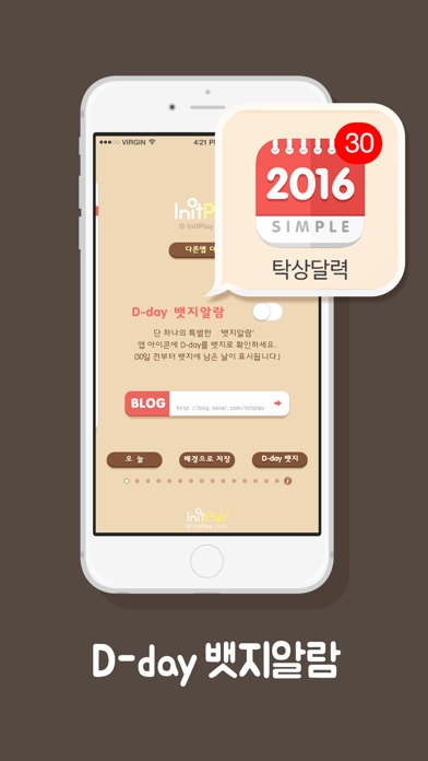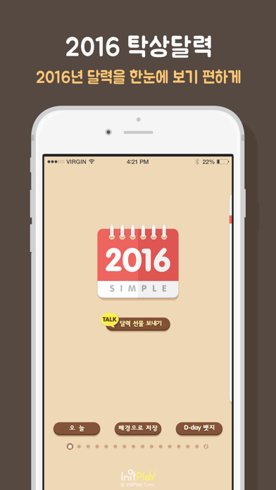 2016년 간단한 탁상달력! 내 손안에 16년 달력 내 스마트폰에도 달력이 하나쯤은 있어야 한다면, 달력 기능에 충실한 이런 앱 하나쯤은 있어야 되지 않을까요? [이런 기능을 합니다] -보기가 편한 달력 -한국의 공휴일, 기념일 표시 -음력이 1일, 15일 단위로 표시 -잠금화면, 홈화면 배경화면으로 달력 저장 -위젯으로 간편하게 달력 확인 (iOS8이상) -뱃지 알람 기능 (앱아이콘에 날짜 표시) [이런 분들께 추천 드립니다] -여러 기능 다 필요 없고, 달력만 딱 볼수 있으면 좋겠다는 분 -날짜가 크고, 잘 보이는 달력을 원하시는 분 -일상생활중, 업무중, 회의중, 공부중 등 바로 볼수 있는 달력을 원하시는 분 -한국형 달력을 간단히 볼수 있으면 좋겠다고 생각하시는 분 -잠금화면, 홈화면 배경화면으로 달력을 설정하고 싶으신 분 -알림센터에서 위젯으로 간편하게 달력을 확인하고 싶으신 분 (iOS8이상) ** iOS8이상의 새로운 기능에 맞춰 위젯 기능이 추가됐습니다. ** - 위에서 아래로 쓸어내려 알림센터를 활성화 시킵니다. - 제일 아래쪽 편집을 터치. - 2016 탁상달력 앞의 +아이콘을 눌러 위젯을 추가합니다. - 완료를 누르면 2016탁상달력 위젯이 알림센터에 설정됩니다. ** 배경화면 저장이 안된다면?? ** - 처음 어플실행 후 배경화면 저장 시 [ "2016 탁상달력"이 사용자의 사진에 접근하려고 합니다. ] 팝업이 떳을때 "승인"을 눌러주셔야 배경화면 저장이 가능합니다. 한번 팝업이 뜨고나면 다시 뜨지 않으니 반드시 승인을 눌러주세요. - 이미 "허용 안 함"을 누르셨다면 아이폰에 설정 > 개인정보보호 > 사진 으로 들어가셔서 탁상달력을 "ON"상태로 바꿔주세요. 혹시 다른 어플 중에서도 비슷한 증상이 있으시다면 이곳을 확인해서 해당 어플이 있는지 찾아보세요.^^