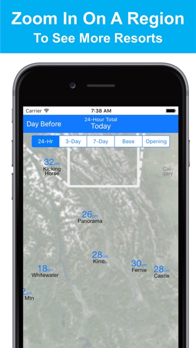 **** Find your snow! ** Download for free today! **** British Columbia-Alberta Snow Map lets you quickly view and compare snow report information for ski resorts across Western Canada in a single glance by showing the information on a map. With BC-Alberta Snow Map app, you can: - View currently reported 24-hour snowfall totals, 3-day totals, and 7-day totals across all resorts. - View snow base statistics across all resorts. - See the same statistics for past dates by swiping left or right on the map. This lets you see how much snow each resort received yesterday, two days ago, etc. - Review detailed snow history for each resort by clicking on the resort to view the resort-specific page within the app. This lets you see many days of snowfall history. - Zoom in to your favorite region of Western Canada to focus on the resorts you care most about. When you reopen the app, the Snow Map will take you right back to the region you were last viewing. - See how snowfall amounts can vary, even among neighboring resorts, letting you find the best snow for your days on the mountain. *** Find Your Snow! ***