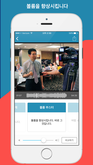 동영상에서 곧바로 오디오를 개선, 증폭, 추출, 음소거할 수 있습니다. 동영상을 가져오면 AudioFix가 즉시 소리를 깨끗하게 만들고 볼륨을 최대화합니다. 다운로드는 무료이므로, 개선된 점을 듣고 직접 시험해본 다음 내보내기를 할 수 있습니다. AudioFix Pro 및 MicSwap Pro가 포함된 Audio Production for Videos 번들을 확인해보세요.  '비교하기'를 길게 눌러서 원본과의 차이점을 직접 체험해보세요. 필터를 길게 누르면 빠르게 볼륨 변경만 들어볼 수 있습니다.  기능