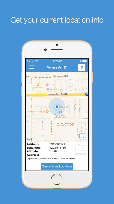 Wondering where you are? This app will show the information of your current location including coordinates and address. And you can share with your friends. Features: - Real-time Updates: Track your current location with coordinates, altitude and address - Social Sharing: Share location with your friends on Facebook, Twitter, Mail, Message and more. Or you can copy it to paste elsewhere. - Compass Mode: Get to know which way you are facing. - Map Type: You can toggle between Standard, Hybrid and Satellite view. And it is free!!