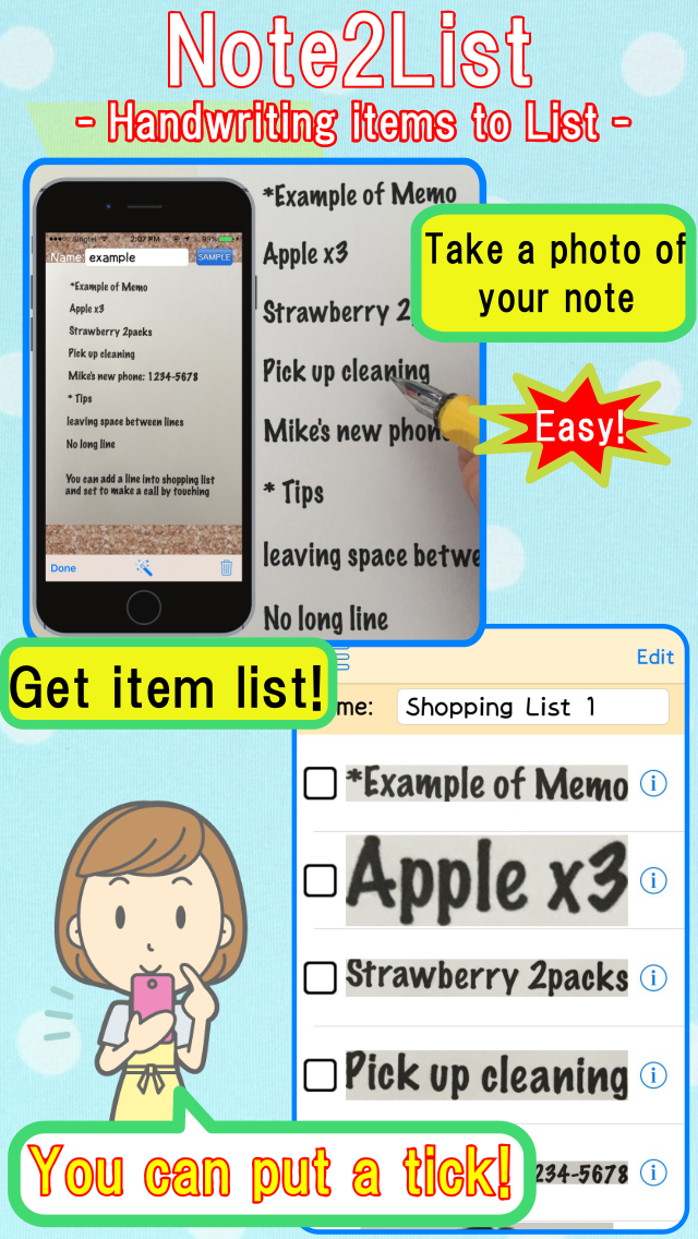 Just taking a photo of your handwriting note, you can get shopping list, todo list, etc. You don't need to type anymore, handwriting is most quick to input items. -How to use Press + button on the All notes screen, you can take a photo of your handwriting note. The Note2List will recognize the items on the photo automatically by pressing magic baton button. You can also add the item by double-tapping on the photo manually. *Tip of handwriting -Leaving space between lines - 1 line has 1 item - No long line You can register all items into one list or each list into different list. Please press list button on the bottom of photo screen and select your prefer list. When you do something about the item, please press check button, the item will be added strikethrough. And you press check button again, the strikethrough will be removed. List button on the left of "All notes" screen, you can see the list view for shopping list or todo list etc. On the list view, when you do someting about the item, pressing check button, the item will be added tick mark. In the case of the item is phone number or e-mail address, by setting the actual phone number and the e-mail addredd with the item, you can make a phone call or send e-mail by pressing action button. -Notice Free version and upgrade Free version of Note2List can manage up to 4 photos. If you like this App, please purchase the upgrade function in Settings to deactivate this limitation.