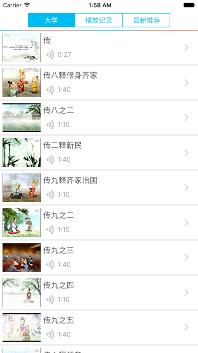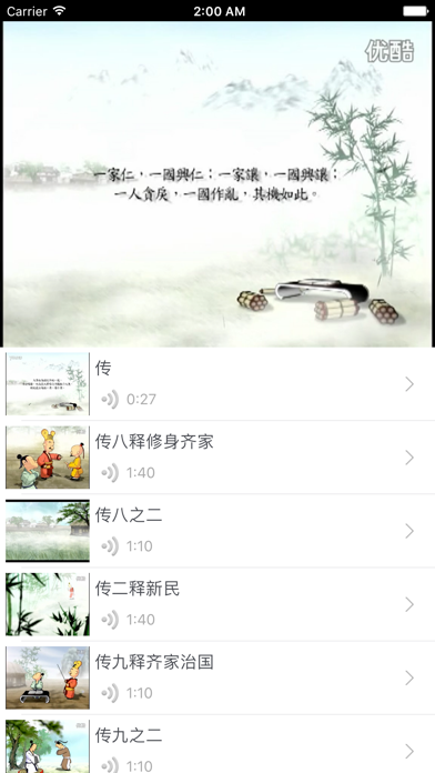 大学之道,在明明德,在亲民,在止于至善. 知止而后有定,定而后能静,静而后能安,安而后能虑,虑而后能得. 物有本末,事有终始.知所先后,则近道矣. 古之欲明明德于天下者,先治其国.欲治其国者,先齐其家,欲齐其家者, 先修其身.欲修其身者,先正其心.欲正其心者,先诚其意.欲诚其意者,先致 其知.致知在格物. 物格而后知至,知至而后意诚,意诚而后心正,心正而后身修,身修而后家 齐,家齐而后国治,国治而后天下平. 自天子以至于庶人,一是皆以修身为本. 其本乱而末治者否矣.其所厚者薄,而其所薄者厚,未之有也. 此谓知本,此谓知之至也. 大学的宗旨在于弘扬光明正大的品德,在于使人弃旧图新,在于使人达到最完善的境界.知道应达到的境界才能够志向坚定;志向坚定才能够镇静不躁;镇静不躁才能够心安理得;心安理得才能够思虑周祥;思虑周祥才能够有所收获.每样东西都有根本有枝未,每件事情都有开始有终结.明白了这本末始终的道理,就接近事物发展的规律了.古代那些要想在天下弘扬光明正大品德的人,先要治理好自己的国家;要想治理好自己的国家,先要管理好自己的家庭和家族;要想管理好自己的家庭和家族,先要修养自身的品性;要想修养自身的品性,先要端正自己的心思;要想端正自己的心思,先要使自己的意念真诚;要想使自己的意念真诚,先要使自己获得知识;获得知识的途径在于认识、研究万事万物.通过对万事万物的认识、研究后才能获得知识;获得知识后意念才能真诚;意念真诚后心思才能端正;心思端正后才能修养品性;品性修养后才能管理好家庭和家族;管理好家庭和家族后才能治理好国家;治理好国家后天下才能太平.上自国家元首,下至平民百姓,人人都要以修养品性为根本.若这个根本被扰乱了,家庭、家族、国家、天下要治理好是不可能的.不分轻重缓急,本末倒置却想做好事情,这也同样是不可能的! 【最全儿歌】:涵盖贝瓦儿歌、兔小贝儿歌、小伴龙儿歌、宝宝巴士儿歌、巴塔木儿歌、little fox、妮妮猫、开心儿歌、蓝迪儿歌、网趣宝贝、六一网儿歌 ...宝宝想听的儿歌,都在这里! 【最新动画】:小黄人动画短片、奇妙汉字、熊出没、大头儿子小头爸爸、臭屁虫、迪斯尼动画、粉红猪小妹、姆姆抱抱、乐比悠悠,乐看儿童动画 ...最新最全的动画片,都在这里! 【最全早教知识】:儿童英语、行为习惯、睡前故事、启蒙认知、学说话、学古诗、认识万物、性格培养、认数字、说英语、十万个为什么、弟子规,背古诗 、伊索预言… 适合宝宝学习的早教儿歌,都在这里! 拥有百万儿歌故事资源,涵盖贝瓦儿歌2015亲宝儿歌兔小贝儿歌故事小伴龙爱奇艺动画屋等资源,适合0-12岁儿童及家长使用。首家精准逐字歌词,宝宝边听边学! 提供妈妈和宝贝最爱的胎教音乐、儿歌童谣、儿童故事、睡前童话、唐诗三字经、作文朗诵、少儿英语、百科全书等有声读物。海量故事,天天更新; 儿歌故事屋,给孩子一个快乐的童年。 唐诗300首:国学经典,十万个为什么,经典儿歌,贝瓦儿歌,儿歌多多,胎教盒子,宝宝树, 辣妈帮,育儿宝典,宋词,元曲,宝巴士大全,智慧幼教,学霸君,启蒙教材,儿童道德丛书,早教图书,汉子王国,魔力小孩,熊猫博士,照顾小宝宝,宝宝知趣问答比试,宝宝爱整理,智能早教小伙伴,欢乐烧烤派对,宝宝钓鱼,幼儿教育游戏,宝宝懂礼貌,宝宝智力游戏,多纳学英语,悟空识字,