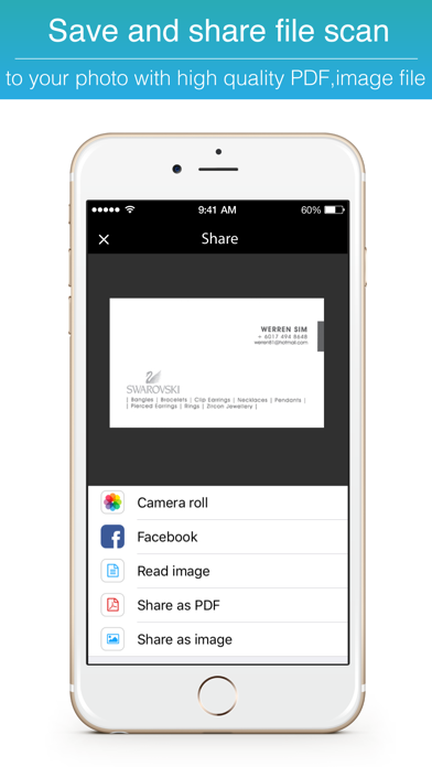 "New experience the simplicity of document scanning" Turn your iPhone and iPad into portable scanners. It allows you to scan receipts, business card, whiteboards, paper notes, book or any multi-page document. Scanned documents can be emailed and printed, uploaded to online services or simply saved on your iPhone or iPad. WHAT ARE THE KEY FEATURES You can use all of this features in application on 100% free!! : • OCR function on English and Spanish version. • Convert image to PDF file. • Capture or import image from the Camera roll. • Automatically detect image rectangle. • Perspective crop with magnetic pointer. • You can rotate with animation, adjustment image in Color, Grayscale and Black & White mode. • So you can share or save into your device and cloud service. WHAT PEOPLE USE FOR • Quickly scan any business card and document anywhere, when you don't have a scanner at hand. • Convert paper notes and sketches into digital copies. • Avoid buying an expensive scanner that you are never going to use. • Have your employees on the road send contracts, sales agreement to the headquarters immediately upon signature. • Expedite expense reports by quickly creating a PDF with all your receipts and send them to Expensify • Get rid of all your paper documents by archiving them to Cloud service.(Google drive, Drop box, Evernote and etc.) or simply saved on your iPhone or iPad. • Quickly scan a form you just printed when you don’t have a scanner. • At the university, take a picture of a whiteboard. • Archive handwritten notes or share them with colleagues. • Save the perfect recipe after cooking. • Save interesting articles and book pages for further reading. • Share a good restaurant menu on Facebook and Twitter. • Import text from the business card, picture and book and share to other by simply process. (Only in OCR version only) Your review and feedback are very important for us. If you like this application, please give a review and feedback in App store. Thank you for everyone who's downloaded and support.