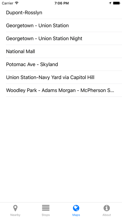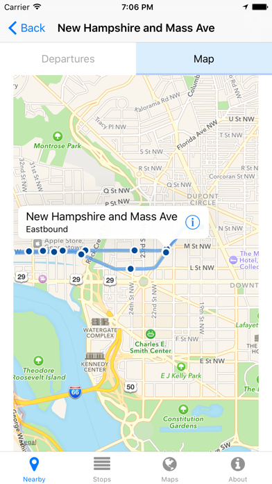 Get real-time arrivals for DC Circulator buses, find the closest stops, and more! It's essential for anyone who uses the DC Circulator. Features - Find the nearest stops and estimated walking times from your current location - View real-time arrivals on all stops of DC Circulator buses - Get maps of all bus routes Data is provided by NextBus, and this app has no affiliation with the DC Circulator.
