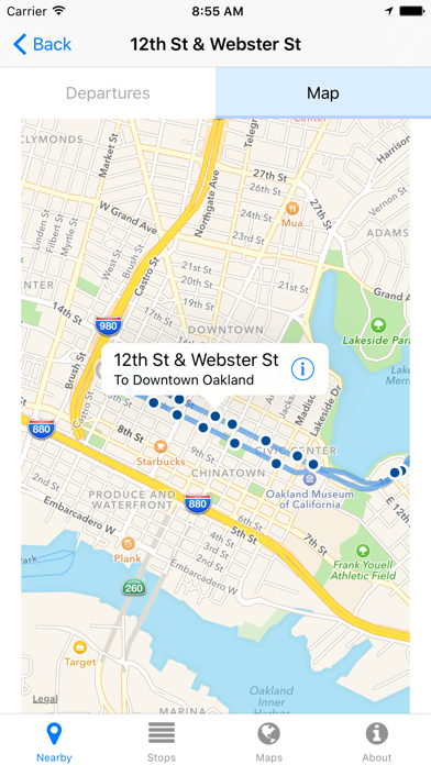 Get real-time arrivals for AC Transit buses, find the closest stops, and more! It's essential for anyone who uses AC Transit. Features - Find the nearest stops and estimated walking times from your current location - View real-time arrivals on all stops of AC Transit buses - Get maps of all bus routes Data is provided by NextBus, and this app has no affiliation with AC Transit.