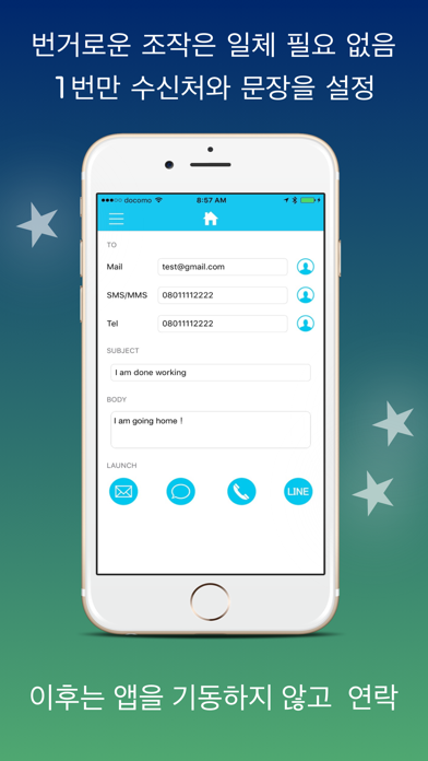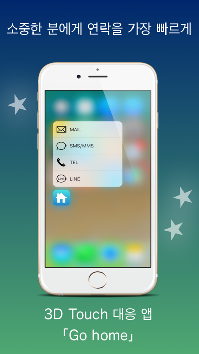 "Go home" is an app equipped with 3D Touch technology, which enables the speediest contact with your loved ones than ever. It accelerates communications with SMS, Email, Line and phone messages Thanks to the 3D Touch technology, the messages such as "I'm going home now" can be sent in one second Just like you feel some comfort when fingerprint authentication is unlocked 0.5 seconds faster than usual, "Go home" reduces time losses for seconds every day enabling smarter "I'm going home" notification. ※For LINE messages, the destinations must be selected because addressing is not supported by the specification of LINE. ・No cumbersome operations required. Registering addresses and sentences in the app only once enables you to send those sentences quickly to the registered addresses. Similarly, it enables you to make prompt phone calls to your specified addresses. Furthermore, as it is linked with iPhone address book, you can easily set addressees of your contacts. ・Non-3D Touch devices are supported as well. Even with non-3D Touch devices, you can send "I'm going home" message smartly in one second With the widget, you can send messages quickly even with other apps and browsers opened.