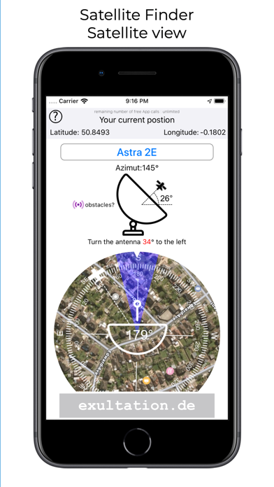 The app helps you to align your satellite antenna. Based on your location and the selected satellite the app shows you in which horizontal and vertical direction you have to align your antenna. As an additional function you can check with the app if obstacles are interfering with the reception. In the current version you can choose from more than 200 satellites. Depending on your location the following satellites are available: ABS 75° E ABS-2 ABS-2A ABS-3A ABS-4 ABS-6 ABS-7 AMC 11 AMC 15 AMC 16 AMC 2 AMC 21 AMC 3 AMC 4 APSTAR 6C APSTAR 7 APSTAR 9 ARSAT 1 ARSAT 2 Al Yah 1 AlComSat 1 Amazonas 2 Amazonas 3 Amos 17 Amos 3 Amos 4 Amos 4° W Amos 7 Anik 107.3° W Anik F1 Anik F1R Anik F2 Anik F3 Arabsat 30.5° E Arabsat 5A Arabsat 5C Arabsat 6A AsiaSat 5 Asiasat 6 Asiasat 7 Asiasat 9 Asiastar 1 Astra 19.2° E Astra 1KR Astra 1L Astra 1M Astra 1N Astra 28.2° E Astra 2E Astra 2F Astra 2G Astra 3B Astra 4A Astra 5B Azerspace Azerspace 2 BELINTERSAT-1 Badr 26° E Badr 4 Badr 5 Badr 6 Badr 7 Bangabandhu-1 Brasilsat B4 BulgariaSat-1 ChinaSat 10 ChinaSat 6A ChinaSat 6B ChinaSat 9 Chinasat 11 Chinasat 12 Chinasat 16 Ciel 2 Directv 10 Directv 102.8° W Directv 11 Directv 12 Directv 14 Directv 99° W Echostar 10 Echostar 11 Echostar 110° W Echostar 12 Echostar 14 Echostar 15 Echostar 16 Es'hail 1 Es'hail 2 Es'hail 25.5° E Eutelsat 10A Eutelsat 113 West A Eutelsat 117 West A Eutelsat 12 West B Eutelsat 133 West A Eutelsat 13° E Eutelsat 16A Eutelsat 172B Eutelsat 21B Eutelsat 33E Eutelsat 36B Eutelsat 3B Eutelsat 48D Eutelsat 5 West A Eutelsat 7 West A Eutelsat 70B Eutelsat 7B Eutelsat 7C Eutelsat 7° E Eutelsat 8 West B Eutelsat 9B Eutelsat Hot Bird 13B Eutelsat Hot Bird 13C Eutelsat Hot Bird 13E Express 140° E Express AM3 Express AM33 Express AM44 Express AM5 Express AM6 Express AM7 Express AM8 Express AMU1 Express AT1 Express AT2 GSAT 10 GSAT 15 GSAT 17 GSAT 18 GSAT 93.5° E Galaxy 14 Galaxy 15 Galaxy 16 Galaxy 17 Galaxy 18 Galaxy 19 Galaxy 23 Galaxy 25 Galaxy 28 Galaxy 3C HellasSat 2 HellasSat 3 HellasSat 39° E HellasSat 4 Hispasat 30W-5 Hispasat 30W-6 Hispasat 30° W Hispasat 74W-1 Horizons 1 Horizons 2 Hylas 1 Insat 4B Insat 4CR Intelsat 10-02 Intelsat 11 Intelsat 14 Intelsat 15 Intelsat 17 Intelsat 19 Intelsat 1R Intelsat 20 Intelsat 21 Intelsat 22 Intelsat 25 Intelsat 28 Intelsat 31.5° W Intelsat 33e Intelsat 34 Intelsat 35e Intelsat 36 Intelsat 37e Intelsat 39 Intelsat 68.5° E Intelsat 903 Intelsat 905 Intelsat 906 Intelsat 907 JCSat 3A JCSat 4B JCSat 5A JCSat 6 Kazsat 2 Kazsat 3 Koreasat 5 Koreasat 6 LAOSat 1 Measat 3 Measat 3A Measat 91.5° E N-SAT-110 NSS 10 NSS 12 NSS 7 NSS 9 Nigcomsat 1R Nilesat 201 Nimiq 1 Nimiq 4 Nimiq 5 Nimiq 6 Optus 10 Optus 156° E Optus C1 Optus D1 Optus D2 Optus D3 Paksat-1R Paksat-MM 1 Palapa D QuetzSat 1 Rascom 1R SES 1 SES 11 SES 12 SES 14 SES 2 SES 3 SES 4 SES 5 SES 6 SES 7 SES 8 SES 9 SES 95° E ST 2 Sky-Mexico 1 Star One C1 Star One C2 Star One C3 Telkom 2 Telkom 3S Telstar 11N Telstar 12V Telstar 14R Telstar 18 Thaicom 5 Thaicom 6 Thaicom 78.5° E Thaicom 8 Thor 0.8° W Thor 3 Thor 5 Thor 6 Thor 7 Thuraya 2 TurkmenAlem Turksat 3A Turksat 42° E Turksat 4A Turksat 4B Vinasat 1 XTAR-LANT Yamal 401 Yamal 402 Yamal 601