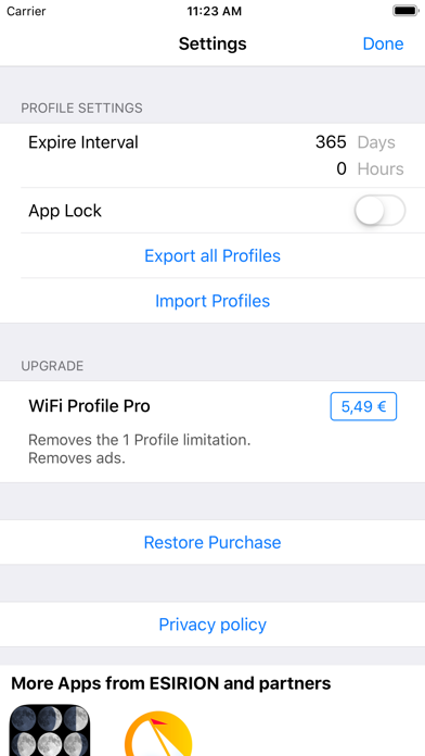 A simple tool to create WiFi profiles on iOS and share them with friends. • Combine many WiFis into one profile • Set a customizable expire date or interval • Install profiles on your own device or share them with others • Show and share QR Codes of your WiFis • iCloud Sync • Import ".mobileconfig" files from apps like Dropbox or Google Drive Notice: WiFi Profile uses a format proposed by ZXing to share WiFis via QR-code. For sharing WiFis as "iOS Profile" we use Configuration Profiles. Both formats contain basic information such as SSID, security protocol and passphrase in plain text.