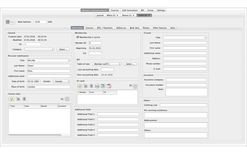 The program "Membership Management" helps you to automate the processes of your organization. The program is designed for all types of associations. In spite of the complicated tasks of membership system, we have tried to make the progran as simple and understandable as possible. The system has several ways to enter data quickly, such as hot-buttons, automate entering the information from a database, etc. The flexible and simple search function in the program database with various parameters simplifies the work considerably. The system allows you to store various information to the members: personal data (place of birth, date of birth), more contact information, more than one address, multiple photos, bank data. There are also a lot of special fields, such as trustee, insurance information or history of issued member ID cards. In the program it is very easy to see in which courses a member has logged in, what invoices were issued to him and what payments were received from him. A balance of the member is also showed. Courses have the following properties: name, description, category, beginning, end, hall, instructor, etc. It is possible to assign a course participant and control availability. Courses can be written to a total invoice or any individual course can be billed. Each course will take place in a room. Rooms can be defined in settings. The program provides a graphical representation of the room occupancy. The system provides the management of member tariffs, automatic billing of members - automatic creation of bills before the start or after the end of the accounting period. From existing in the program accounts a SEPA direct debits can be created. These can be stored in an XML file and is used for automatic debiting of amounts in online banking. The selected accounts will be marked as "paid" and corresponding payments are generated. The program has different statistics and graphs, such as the number of active members or sum of invoices issued.