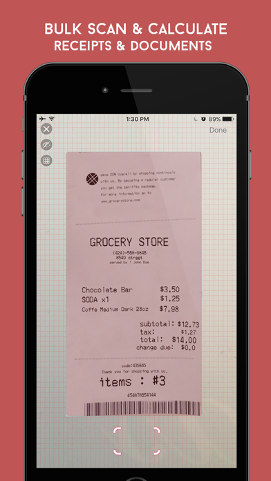 Calculate receipts/documents in bulk with your camera. Camculator allows you to scan receipts,documents and extract the numbers out of them very easily. Using the positioning overlay tool you can align the receipts/documents just right so that you can calculate all of them in one tap. Features: -Scans Documents/Receipts -Guides and Ghosting Overlay so that you can position the documents receipts. -Bulk Cropping -Select Cropping -Converts Selected Numbers into numbers that are calculated -Easily allows you to revise results. We've tested Camculator with over 1000 receipt images but the app still has room to grow for receipts with even weirder fonts. So if you're not getting the results that you should with the app, please contact us and send us the receipt we'll make sure to make the app work with those receipts as well. Contact Email: [email protected]