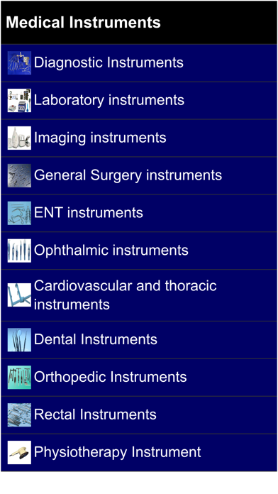 Medical Instruments app is totally free and contains the largest collection of Medical Instruments in more than 10+ category. You can find images and uses of each and every instrument.Each and every instruments is explained category wise like Diagnostic,Laboratory,Imaging,General Surgery,ENT,Ophthalmic,Cardiovascular,Dental,Orthopedic,Rectal and Physiotherapy. This app contains instruments that are used daily in surgical operation theaters and medical and other wards. Medical Instruments Category:- - Diagnostic Instruments - Laboratory instruments - Imaging instruments - General Surgery instruments - ENT instruments - Ophthalmic instruments - Cardiovascular and thoracic instruments - Dental instruments - Orthopedic instruments - Rectal instruments - Physiotherapy