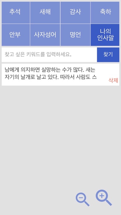 인사말 프로가 새롭게 업그레이드되었습니다. 민족 최대의 명절 한가위, 설날!!! 가족, 친척, 친구, 지인들에게 덕담 한마디를 건네보세요. 생일, 승진, 결혼 축하 및 감사 메시지를 보내보세요. 무슨 말을 보내야 할지 걱정이 라구요? 이제 더 이상 걱정 할 필요가 없습니다. 바로 “인사말" 앱 하나면 쉽고 빠르게 전달 할 수 있습니다. 300가지 이상의 인사말이 저장되어 있어 원하는 내용을 "문자"로 쉽게 보낼 수 있습니다. 또한 "나의인사말" 기능을 이용하여 내가 자주 보내는 인사말을 저장 후 쉽게 보낼 수 있습니다. 400개 이상의 사자성어와 명언이 추가 되었습니다. 사용법 1. 원하는 문구를 선택한다. 2. 상대방의 이름 또는 내용을 수정한다. 3. "문자"로 전송하기 버튼을 누른다. 4. 보낼 사람을 선택 후 전송한다. 5. -- 끝 -- “나중에…” 라고 하면 늦습니다. 지금 바로 하세요. 카카오톡 링크 서비스 변경으로 더이상 카톡 서비스는 지원되지 않습니다.