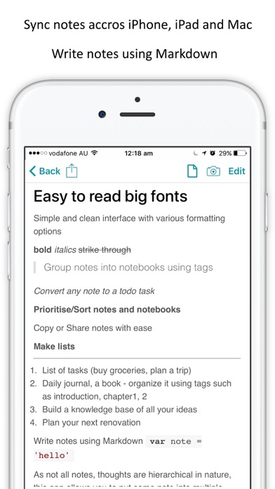 Note Taking: Notes & Notebook is very flexible way to organize notes, thoughts ideas, tasks, todo, checklist, reminders, errands or anything you want to capture using tags. The most intuitive and easiest way to access your notes using many different ways to search including full text search. Main features - Easy to read big fonts with simple and clean interface - Group notes into notebooks using tags - Sync notes across iPhone, iPad and Mac using iCloud - Organize important notes and notebooks by reordering - Super quick full text search across all notes or within a notebook - Convert any note to a todo task - Add Photos - Copy or Share notes with ease - Secure / Lock your notes using password - Use Markdown including images, links and code with syntax highlighting - Add reminders to any note or todo task - As not all notes or thoughts are hierarchical in nature, we allow you to put same note into multiple notebooks - Handwritten notes, write notes in your handwriting - Draw and sketch using different color / colour Examples of how you can best use this app 1. List of tasks, errands (plan a trip, prepare for conference talk or create a groceries list) 2. Daily journal, diary, your next book 3. Build an organized knowledge base of all your ideas 4. Plan your next big renovation 5 Bookmark or add a link to webpage within notes