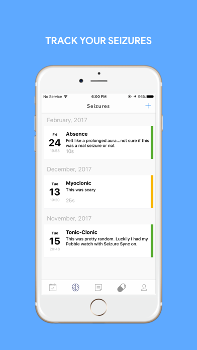 Seizure Sync is an epilepsy management app that lets you track and monitor your seizures, and will send you reminders for when, and how much medication to take. We will: - Send you reminders for when to take medication and how much to take - When connected to a Pebble smart watch, automatically detect and record convulsive seizures - Sends instant SMS and Email notifications to your loved ones in case of an emergency - Keep a constant record for your family and doctors - Help you gain a better understanding of your epilepsy by making it easy for you to note seizure triggers, types, and stresses, through our journal logging