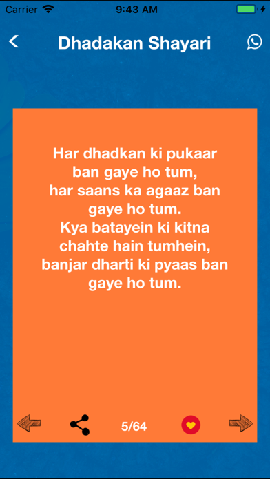 Dhadkan Shayari is unique poetic way to express yourself your feelings deep in heart. This app is the right place for Specially Ishq Shayari on every Best in class categories like Dard bhari shayari, break up Shayari , Sad Shayari , bewafai This app contain Largest Collection of Shayari in Both Hindi and English. There are lots of shayari categories like love , infidelity , pain , friendship , humor , Gila regrets , ghazals , Bollywood , Urdu , wine , birthday , congratulations , lovers , writer of poetry , other poetry , remember , wait , good night , Good morning. Some more Shayari Categories : - Sad, Dosti, Bewafa, Dua, Lovely, Inspire, Intezaar, Urdu, Sharabi, Arzoo - Yaad, Barish, Chahat, Dil, Ajnabi, Doorie, Ehsaas, Gujrati, khuwab - Mausam, Christmas, New Year, Love, Dard, Funny, Hindi, Romantic, Moody - Marathi, Punjabi, Mehfil, Mohabbat, Wafa, Judai, Dhoka, Pyar, Ishq, Ansoo, Tanhai