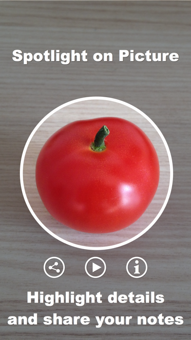 Spotlight on Picture - a simple tool for taking a picture with highlighting and focusing on specific details on the picture and for sharing your notes quickly. The app has simple and intuitive interface with key features at your fingertip.