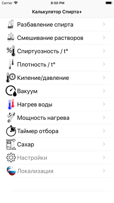 Калькулятор для разбавления спирта (расчета необходимого количества спирта и воды для получения спиртовой смеси нужной крепости). Расчет производится с учетом контракции. Дополнительно: + расчет температуры кипения и спиртуозности под вакуумом(пониженном давлении в системе) + расчет смешивания двух/трех растворов разной спиртуозности. + расчет разбавления по весу. + расчет спиртуозности раствора в кубе и пара по температуре в кубе. + расчет изменения плотности от температуры. + расчет спиртуозности от температуры кипения с учетом атм.давления. + расчет смешивания холодной и горячей воды для получения заданной температуры и объема. + во всех вкладках сохраняются данные на момент закрытия. + вкладка расчета растворения сахара в воде. Постоянные доработки и обновления. Версия без рекламы.