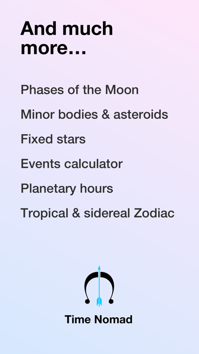 Time Nomad is one of the top astrology apps and perhaps the best free astrology app available on iPhone. Time Nomad is an advanced planetary positions calculator software that ensures accurate birth chart calculations. The app can also build precise astrological charts for any given date within nearest centuries. Time Nomad software is unique in its ability to calculate both tropical and sidereal zodiac systems using high precision ephemeris. The app comes with a planetary hours calculator, planetary hours alarm and other tools to work with planetary days of the week. Astrological widgets included with the app: — Current Astrological Chart widget — Planetary Hour widget — Planetary Weekday widget — Phase of the Moon widget You can create an unlimited amount of personal astrological profiles. All data belongs to you and stored on your iCloud account. No login or registration required. With Time Nomad you can analyse any number of natal charts — for yourself and other people. Time Nomad calculates your astrological transits, phases of the Sun and the Moon, movement of planets through the Zodiac. You can use Time Nomad to better understand astrology and answer the question “what is astrology” thus learning how to become a professional astrologer, with time. Via Time Nomad blog — https://timenomad.app/posts/ — the app provides a virtual astrology training for those who are interested in astrological studies or simply curious about how and why astrology works. Time Nomad will provide you with regular weekly astrology lessons and predictions. The app will be your virtual astrology teacher for years to come. All astrological information presented in unadorned, concise yet fully interactive and expressive manner to help you seeing the bigger picture. Key features include: — Dashboard with phases of the Sun, the Moon, retrograde planets, Moon Void of Course, solar return, lunar returns, lunar month, solar-lunar arc, etc. — Summary of upcoming astrological events — Widget with current astrological wheel chart and a phase of the Moon — Accurate ephemeris for all major and minor planets including asteroids — Astrological chart for any time and geographical location — Sidereal Zodiac calculator — Tropical Zodiac calculator — Fixed stars calculator including aspects and parallels — Astrological transits for today or any day — Retrograde planets calculator — Natal chart calculator — Synastry and composite chart calculator — Progressed chart calculator — Planetary hours calculator including planetary hour alarm — Numerical astrology calculator reports — Solar system view — Detailed report of current and upcoming astronomical and astrological events The app is distributed under the standard Apple End User Licence Agreement (EULA) which can be found at https://www.apple.com/legal/internet-services/itunes/dev/stdeula/
