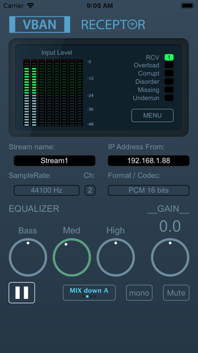 VB-AUDIO Software / VBAN-Receptor allows listening to any VBAN Streams in any audio formats (1 to 8 channels) and transform your mobile device in High Quality Wireless Headphone. The integrated 3 bands vintage EQ and Analog Gain Control will give you a unique audio experience. VBAN protocol is made to transport native audio in PCM format on any local network (LAN or WLAN). VBAN Stream can be generated by Voicemeeter Application, the Virtual Audio Device Mixer (www.voicemeeter.com) HELP: How to send VBAN Stream to Mobile Devices: https://forum.vb-audio.com/viewtopic.php?f=6&t=443 Additional Features: - Play / Stop Streaming. - Mono / Mute button. - Mix Down Mode to listen 5.1 or 7.1 stream. - -60 to +12 dB Master Gain. - 3 Bands Equalizer (Bass, Medium, Treble). Other functions in menu: - Display mobile device IP-Address. - Setup VBAN Protocol UDP port. - Setup Network Quality (to optimize latency). - Delay (0 - 500ms) to synchronize several devices.