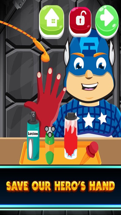 The superheroes are back! This time they have injured their hands whilst keeping the world safe from the super villains! Choose from 6 superheroes and use exciting technology such as X-Rays and the latest medical equipment such as super lotion to heal their hands! A game that is fun for all ages, download it FREE today and help these superheroes get back to action!