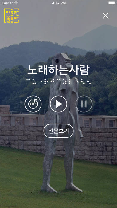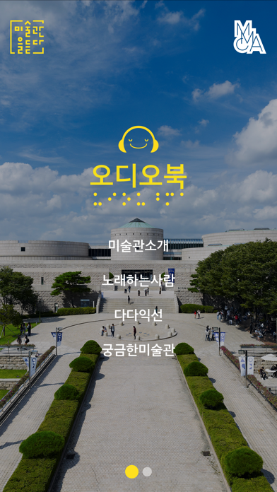 국립현대미술관 과천관 소개 오디오북으로 시각장애청소년 미술프로그램과 촉각책을 연계하여 교육용으로도 활용하는 미술관 앱 -미술관소개 -노래하는사람 -다다익선 -궁금한미술관 iOS 8.0 이상 지원
