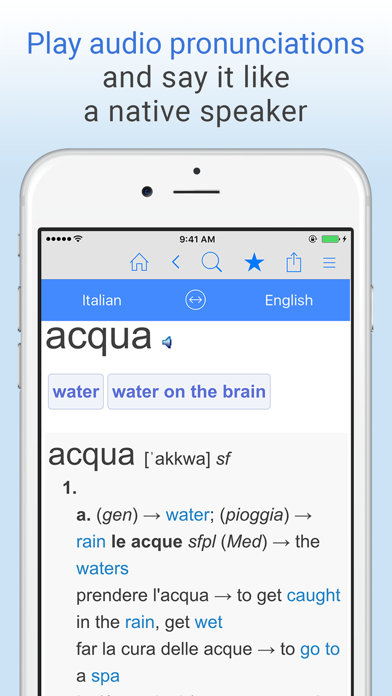 Free English-Italian translation dictionary and phrase translator. Translate words from English to Italian or Italian to English, even offline! Search by voice, play audio pronunciations of words, save unlimited bookmarks, and more. The perfect app for learning Italian or traveling to Italy! * Get both English-Italian and Italian-English translations, all from authoritative sources. * Quickly translate with a user-friendly interface. Change translation direction with one tap. * Use voice search to look up a word just by saying it. * Access offline translations. No additional downloads required! * Play audio pronunciations and learn how to say the word like a native speaker. * Save unlimited bookmarks and quickly view important words, common phrases, and questions. * Learn from definitions, example sentences, and more. * Always find what you're looking for with advanced search options. * See search suggestions as you type. * View recent searches. * Adjust font size. * Share your favorite words through social networks, emails and text messages. (With supported devices) * This is not a trial version. You can access all content immediately and forever! How do we do it? TheFreeDictionary.com - Farlex apps have been downloaded tens of millions times across multiple platforms, with top ratings after hundreds of thousands of reviews. We work with the best publishers to bring together trusted content in the most comprehensive, authoritative dictionary apps on the market. Our flagship app is The Free Dictionary (TFD), powered by TheFreeDictionary.com. Find our other apps by searching "Dictionary by Farlex" in the App Store.