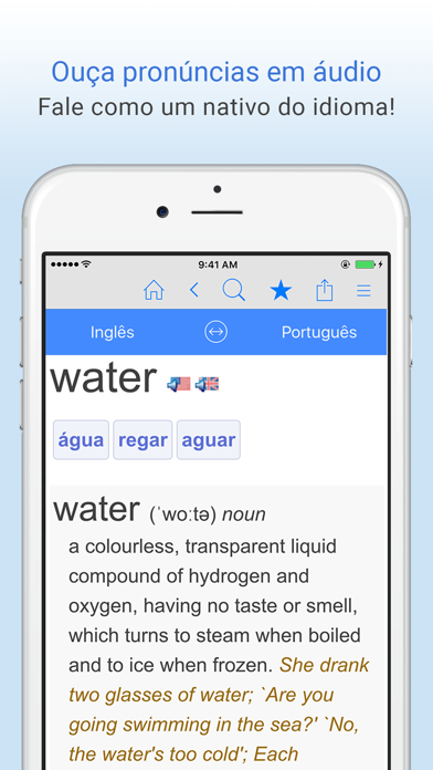 Traduza palavras e frases comuns do português para o inglês OU do inglês para o português! O Dicionário de Traduções Português-Inglês da Farlex mostra traduções instantâneas com busca de voz ou texto, além de pronúncias em áudio, definições, sentenças de exemplos e muito mais! * Digite sua busca ou use busca em voz nativa para simplesmente falar a palavra que deseja traduzir. * Tradutor off-line! Acesse traduções palavra por palavra sem a Internet. * Ouça pronúncias em áudio de palavras, frases comuns e questões (somente no modo on-line). Fale como um nativo do idioma! * Encontre a palavra certa. Veja definições e sentenças de exemplos para ajudá-lo a encontrar a melhor tradução. * Salve favoritos sem limites e acesse rapidamente todas as suas palavras. * Alterne o modo de tradução de inglês-português para português-inglês com um toque. * Opções avançadas de busca. * Compartilhe suas palavras favoritas através das redes sociais, e-mails e mensagens de texto. * Fácil de usar! Perfeito para viagens ou para aprender um novo idioma. Como nós fazemos isso? A Farlex é líder em produtos de referências online. Nós trabalhamos com os melhores editores para disponibilizar conteúdo confiável nos aplicativos de referência mais abrangentes e oficiais do mercado. Nosso aplicativo principal é o The Free Dictionary (TFD), distribuído pelo TheFreeDictionary.com.