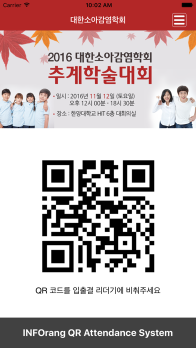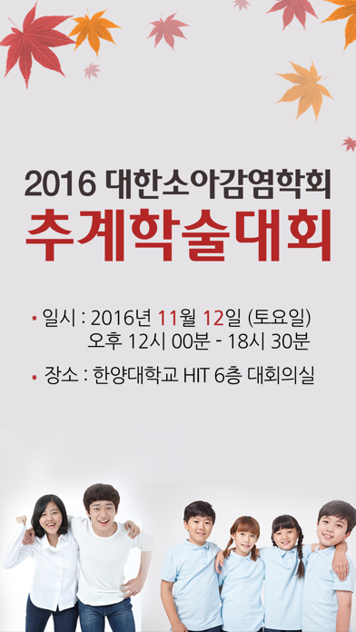 2016년 대한소아감염학회 추계학술대회 입출결 앱(App) - 일시 : 2016.11.12(토) / 12:00 ~ 18:30 - 장소 : 한양대학교 hit 6층 대회의실 - 주최 : 대한소아감염학회 - 사전등록 : 2016년 11월 9일(수) 까지 - Tel : 02-3478-1668 - Fax : 02-3478-1667 - E-mail : [email protected] - 학술대회 안내페이지 : http://www.kspid.or.kr/abstract/2016_fall/ [학회 홈페이지] http://www.kspid.or.kr