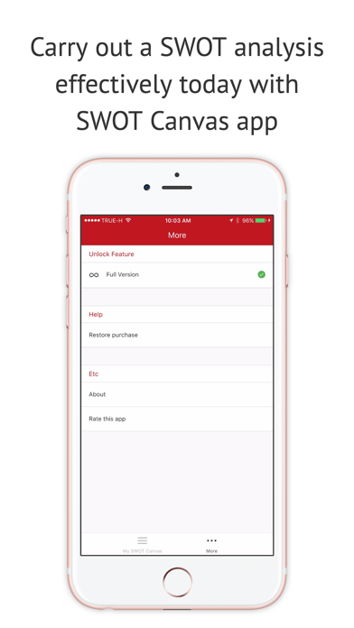 Conduct a SWOT analysis on your mobile phone. SWOT analysis is an acronym for strengths, weaknesses, opportunities, and threats—and is a structured planning method that evaluates those four elements of a project or business venture. Thiss app lets your create and conduct SWOT analysis effectively on your device. You can also view and export your canvas as PDF .