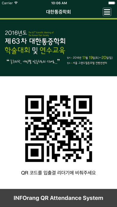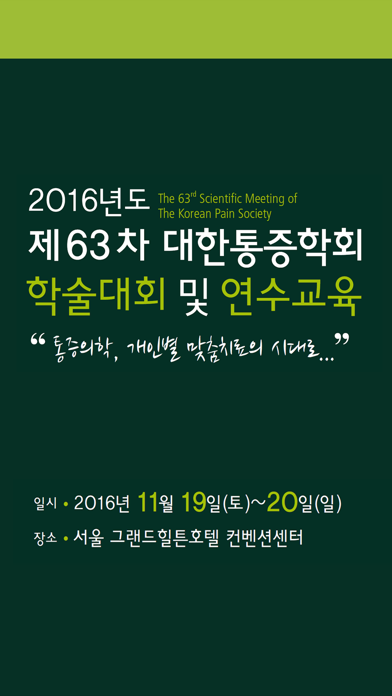 2016년도 제63차 대한통증학회 학술대회 및 연수교육 입출결 앱(App) - 일시 : 2016.11.19(토)~20(일) - 장소 : 서울 그랜드힐튼호텔 컨벤션센터 - 주최 : 대한통증학회 행사페이지 : http://www.painfree.or.kr/abstract/2016_fall/ [문의처] 대한통증학회 사무실 - Tel : 02-6241-7582 - Fax : 02-6241-8275 - E-mail : [email protected]