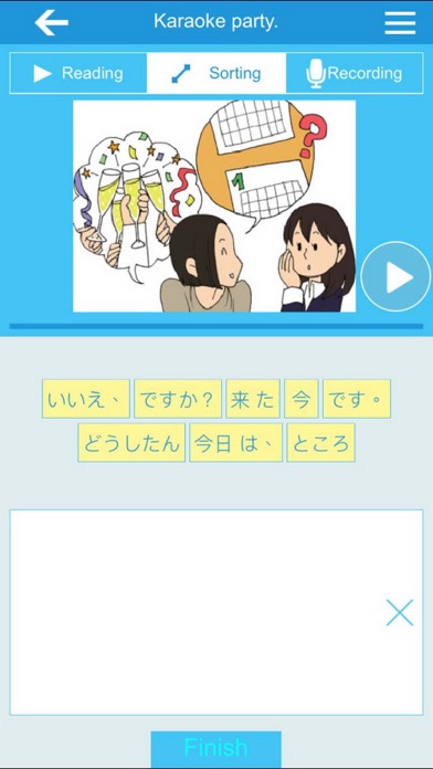 New concept Japanese (Tchin) is a total of 36 classes, and the book main focus on the daily life of communication skills. The animation plot of this book included many kinds of situational dialogues such as learning, dating, having dinner, swimming, being a guest and visiting. And this will help you deal with all kinds of problems in your life. Audio recording by the professional team of Japanese native speakers Recording simulation Room can help you master the standard pronunciation, it can record your pronunciation, and then compare it with the teachers’, after that, you will be surprised by your progress. After all the audio images are downloaded to your phone, you can study them anytime and anywhere without internet environment. Personalized Design of Operation. 1. Courses learning Module 1.1 We have illustrated content, lively and interesting animation with rigorous plot. It can offer you English, Rome tone and Japanese translation. 1.2 Each sentence can be looped and listened at any time, and you won’t miss any sentence. 1.3 We have sentence collection function, you can read the sentence you collected at any time. 2. Sorting the words Module 2.1 Practicing the knowledge, and sorting the disordered sentence. It can help you know more about the grammar and handle the sentence structure better. 2.2 We will offer the comment of your sorting skills, and let you know your progress or shortage in this area. Edutainment can improve the study efficiency. 3. Left side bar 3.1 It has the buttons of looping both the current courses and all the courses. You can use our app on the road, in the bus anytime and anywhere. 3.2 It has the buttons of looping both the current courses and all the courses. You can use our app on the road, in the bus anytime and anywhere. 4 Recording simulation Module 4.1 You can compare your pronunciation with Japanese native speakers’ many times, until you are satisfied with your pronunciation. This function will help you handle the standard pronunciation quickly, and solve the problem of many learners are shy to speak. You can also store your recording, and listen to it many days later.