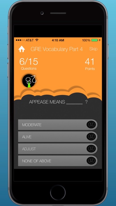 This app has GRE Vocabulary Quiz Part 4 for 15 Words. It is vital to improve the Vocabulary for good score on GRE Verbal. It is in Multiple Choice format with Timed score. There are negative points for incorrect answers. This is fun way to learn new words.